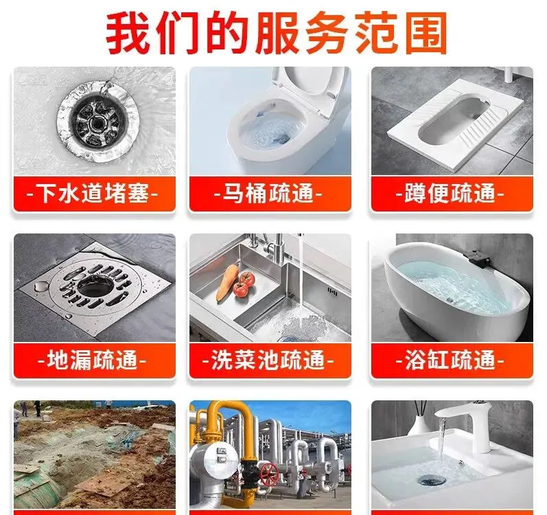 疏通服务:下水道、马桶、蹲厕、地漏、下水管、脸盆、菜盆、墩布池、坐便器、小便池、主管道。