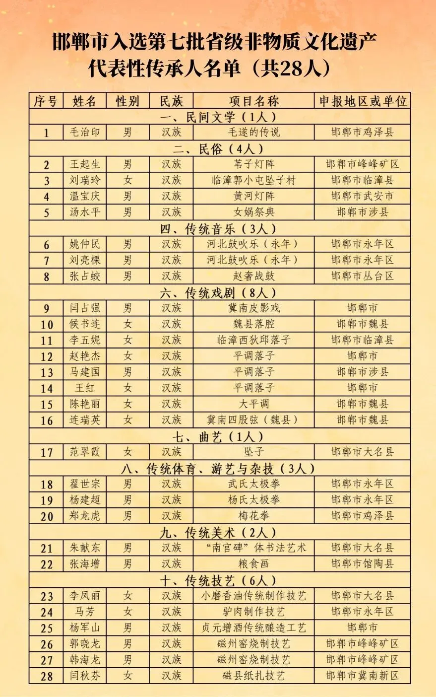 2025年10月31日,河北省文化和旅游厅公布了《关于公布河北省第七批省级非物质文化遗产代表性传承人的通知》(冀文旅非遗字〔2025〕3号),共167人。其中邯郸28人入选,涵盖八个门类,入选人数全省第一。