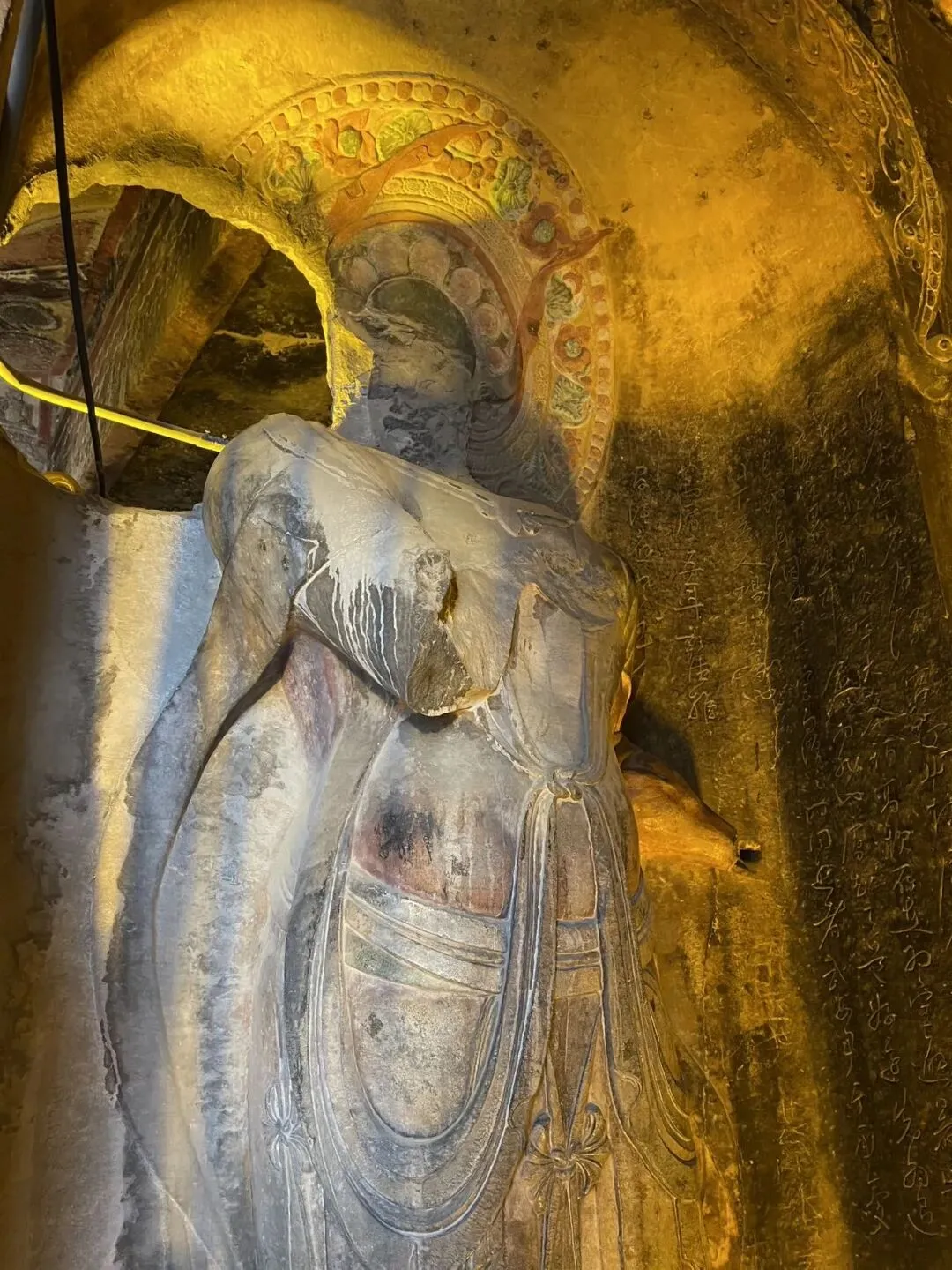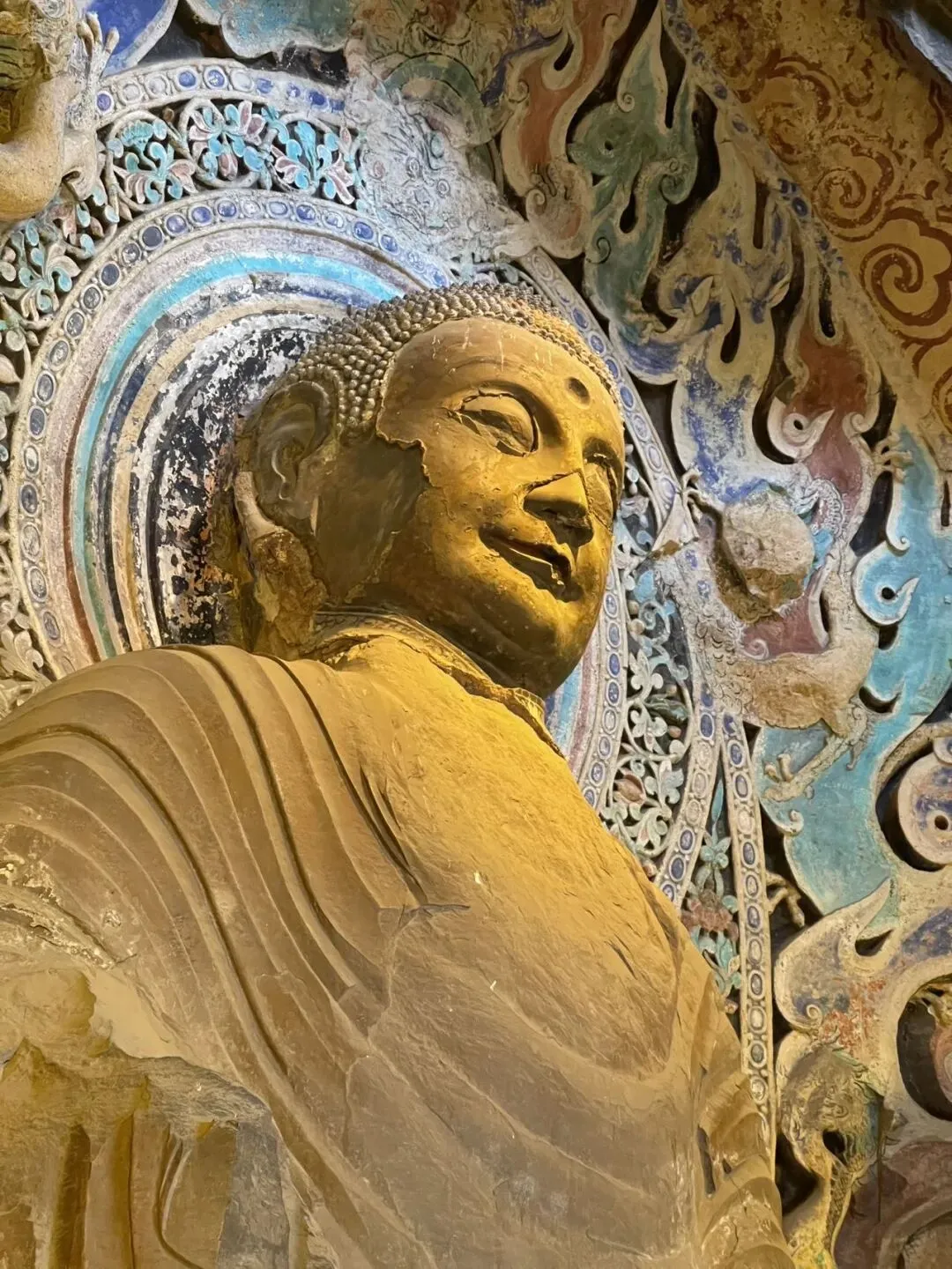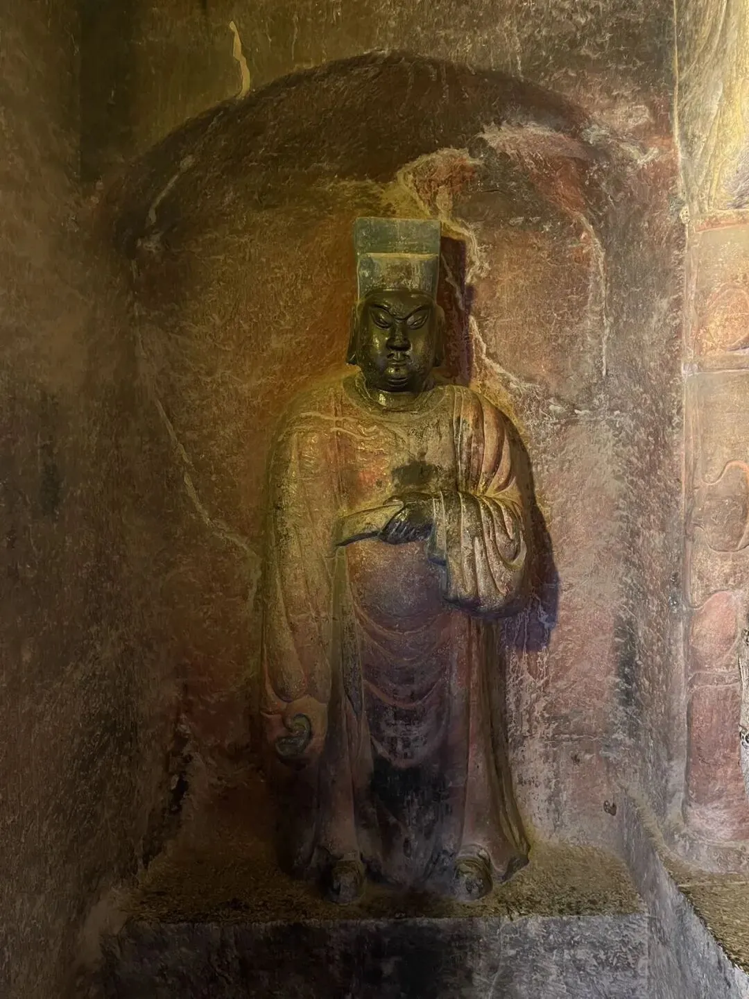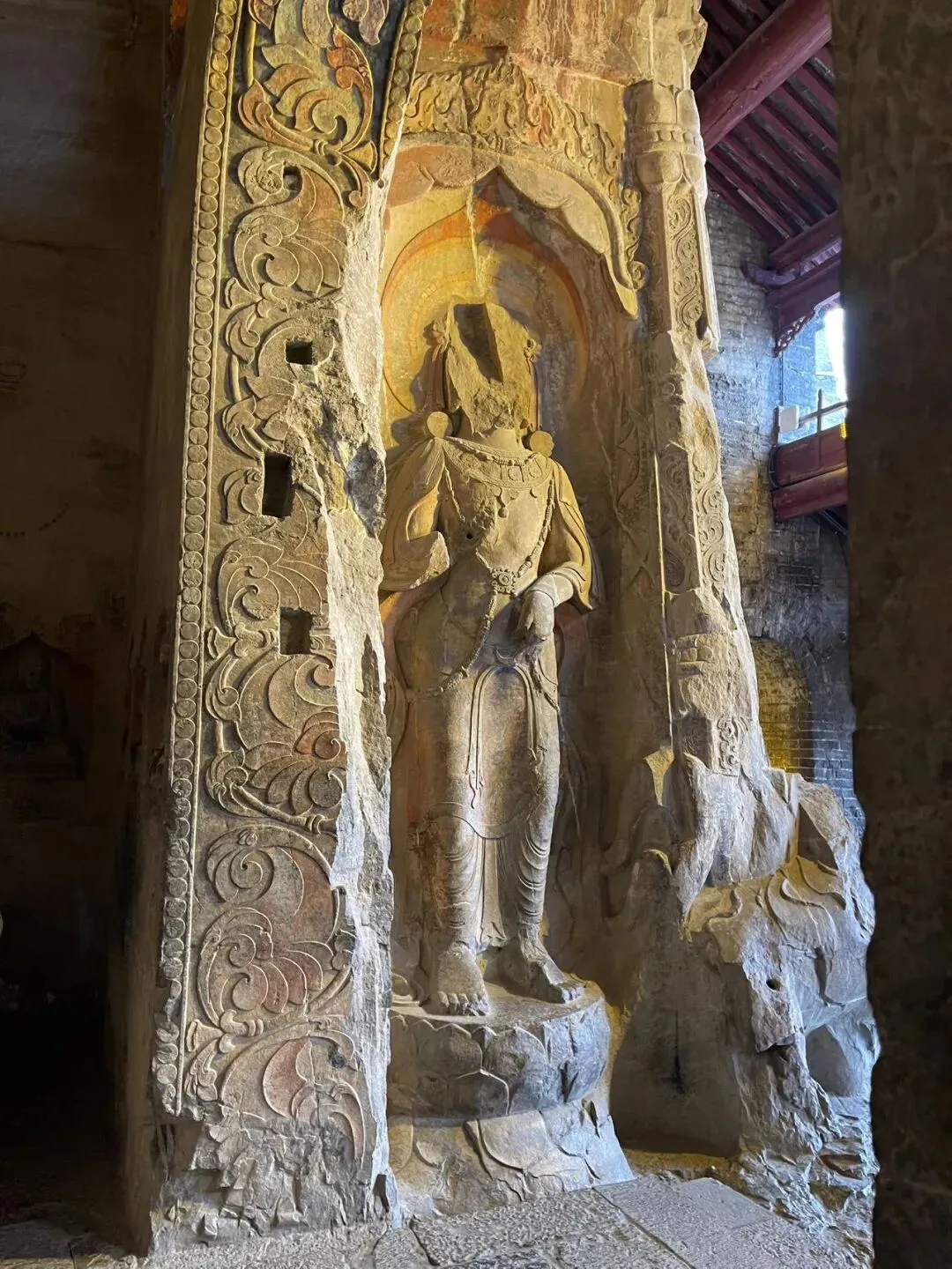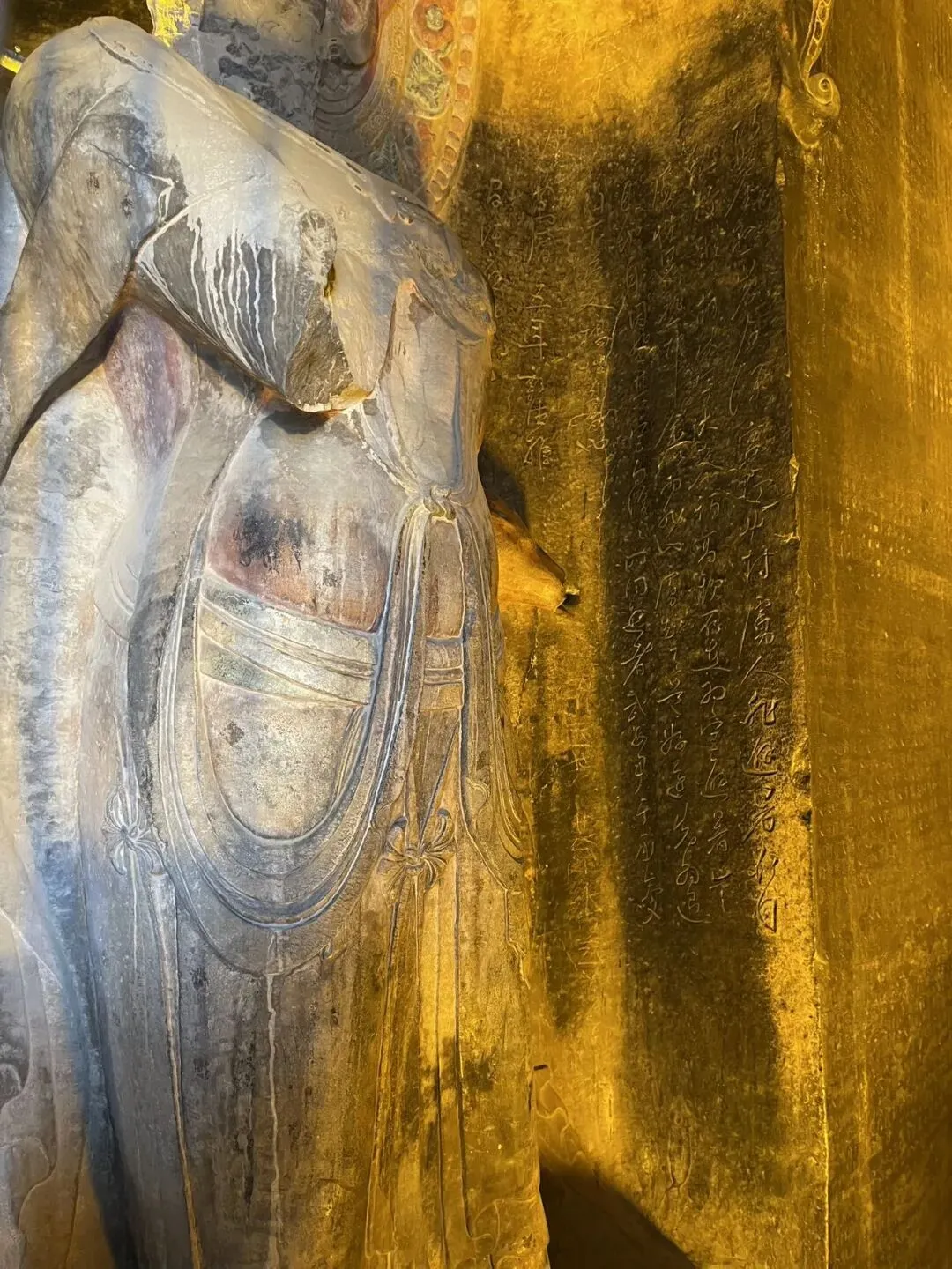 还没进门就被彩绘吸引了。还有两位弟子藏在菩萨身后,紧贴墙壁。从门口完全看不到。