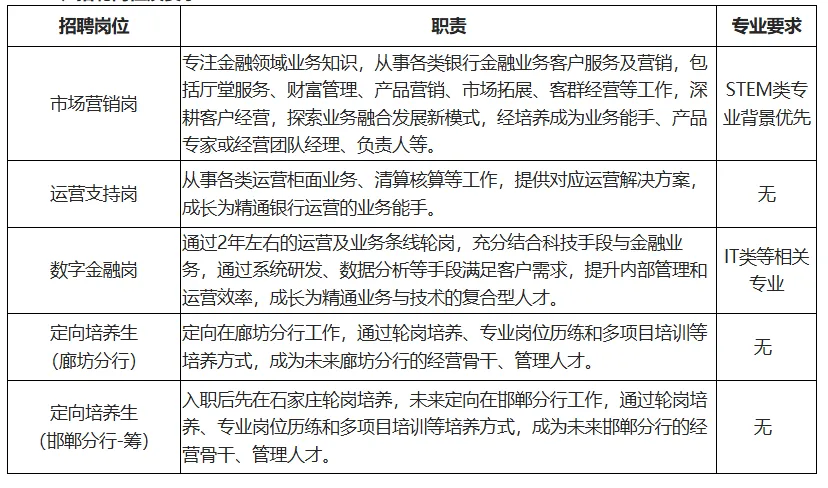 现根据业务发展与人才培养的需要,招商银行石家庄分行面向境内境外院校诚邀2026年毕业生加盟,具体要求如下: