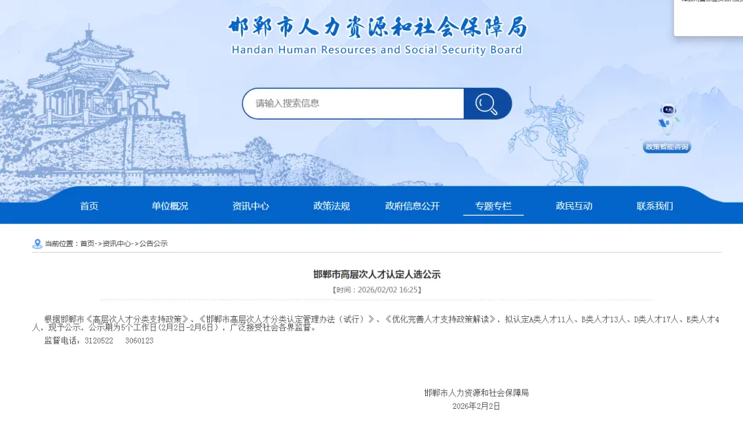 根据邯郸市《高层次人才分类支持政策》、《邯郸市高层次人才分类认定管理办法(试行)》、《优化完善人才支持政策解读》,拟认定A类人才11人、B类人才13人、D类人才17人、E类人才4人,现予公示,公示期为5个工作日(2月2日-2月6日),广泛接受社会各界监督。