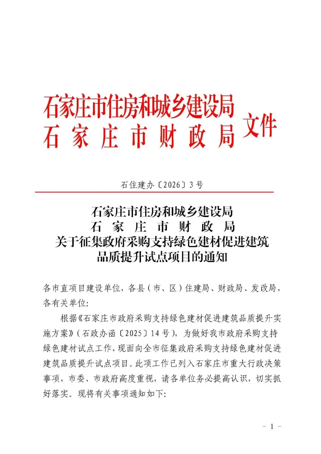 >石家庄丨关于征集政府采购支持绿色建材促进建筑品质提升试点项目的通知