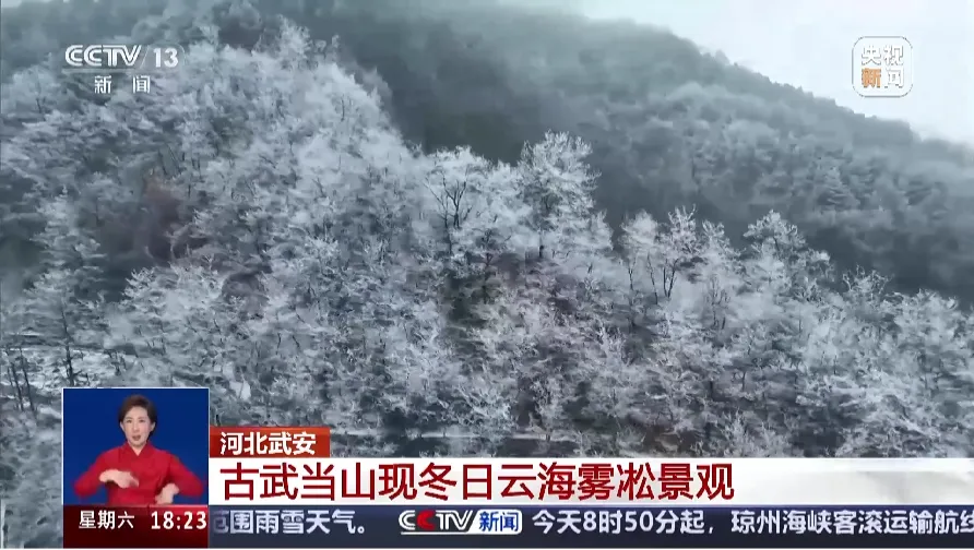 巍峨的古武当山被淹没在一望无际的云海之中。若隐若现,宛若仙境,构成了一幅唯美的画卷。而漫山的树木枝条上也挂上了一层晶莹的冰花,形成蛇年新春第一场雾凇。