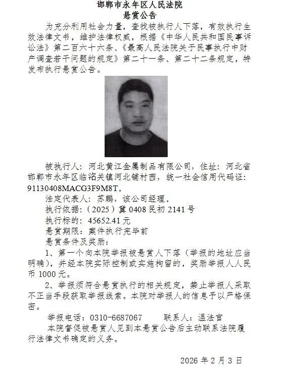 >邯郸市永年区人民法院悬赏公告(2026年第七期)