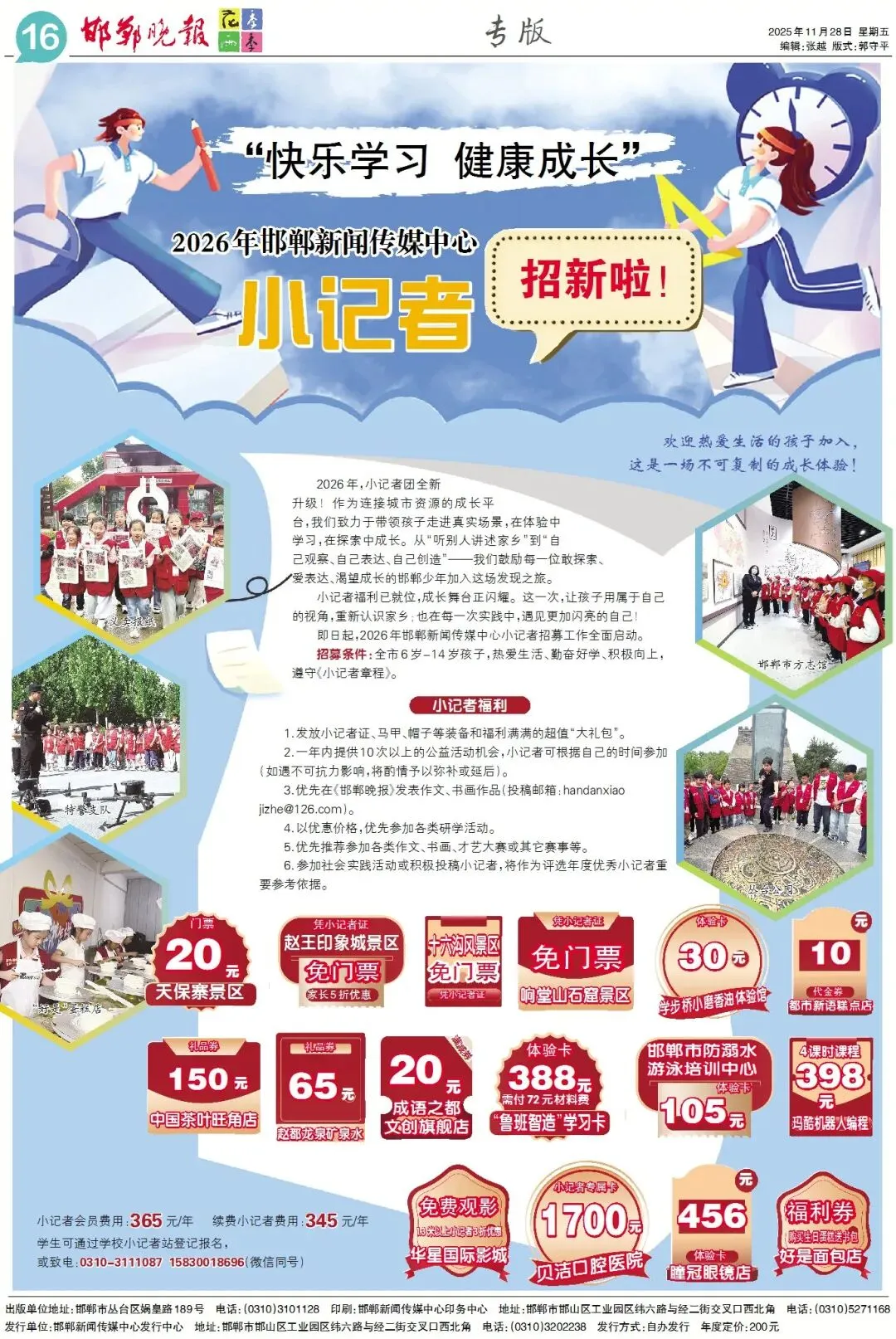 2026年度邯郸新闻传媒中心小记者(持有小记者证件)均享受以下优惠。
