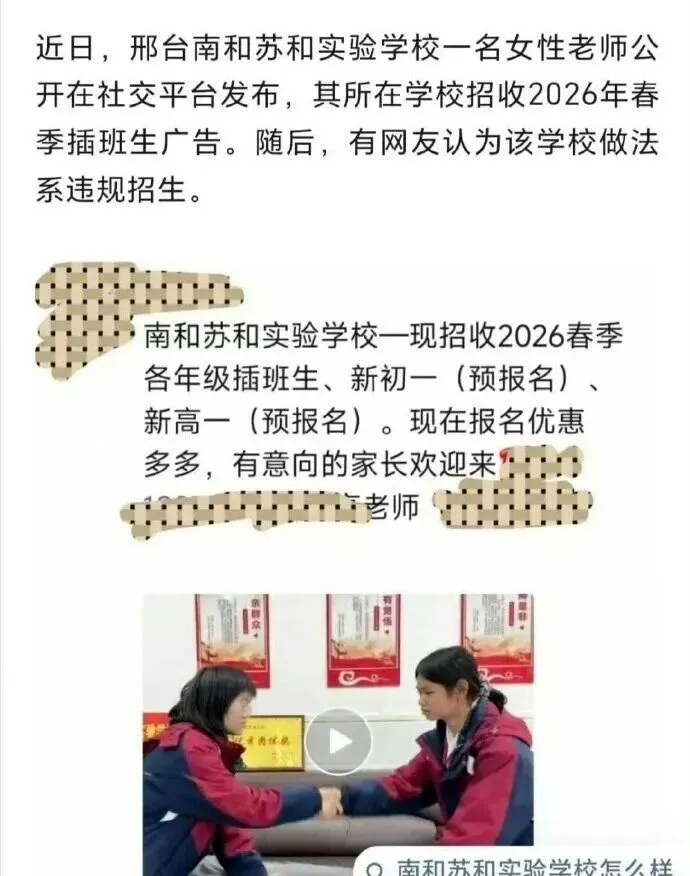 近日,邢台南和苏和实验学校一名女性老师公开在社交平台发布,其所在学校招收2026年春季插班生广告。随后,有网友认为该学校做法系违规招生。该招生信息显示,招收各年级插班生,新初一(预报名)、新高一(预报名),现在报名优惠多多。同时,留下了联系方式和微信号。日前,该女性老师表示,其发布的信息确实真实,所有报名的学生考试时间为2026年2月7日(农历腊月20)。有相关人士表示,借读生(插班生)本身是违规的,公开招收就是向教育部挑战。希望当地教育部门能介入调查,对涉事学校和领导、老师进行追责。同时,严厉整治初高中学校“借读乱象”,严刹借读之风。【版权声明】文章是为传递更多信息,无商业目的。文字和图片版权归作者所有,若有来源标注错误或侵犯了您的合法权益,请作者与我们联系,我们将及时更正、删除。