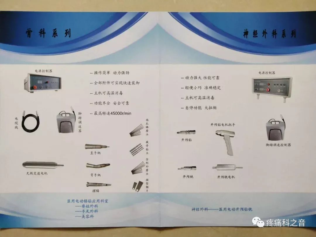 器械:针刀、刃针、长针头、松筋针、埋线针、椎间盘针、侧隐窝针、银质针、钩针、骨减压针、灌洗针、穿刺针、火针、中频、微波、20路内热仪、麻醉枪、臭氧机、射频、离子束疼痛治疗仪(高频电火花治疗仪)、医用离心机、体外冲击波、医用电动锯钻、关节镜、动力系统 膝熏洗 经络通等