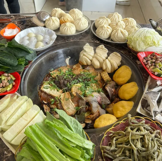 中午可以去温塘吃一顿柴锅炖菜。