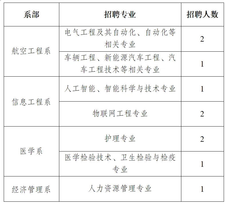 岗位要求:研究生及以上学历;航空工程系、信息工程系、医学系岗位具有中级职称或3年以上行业工作经验者可放宽至全日制本科学历(本科院校为省属重点院校)。