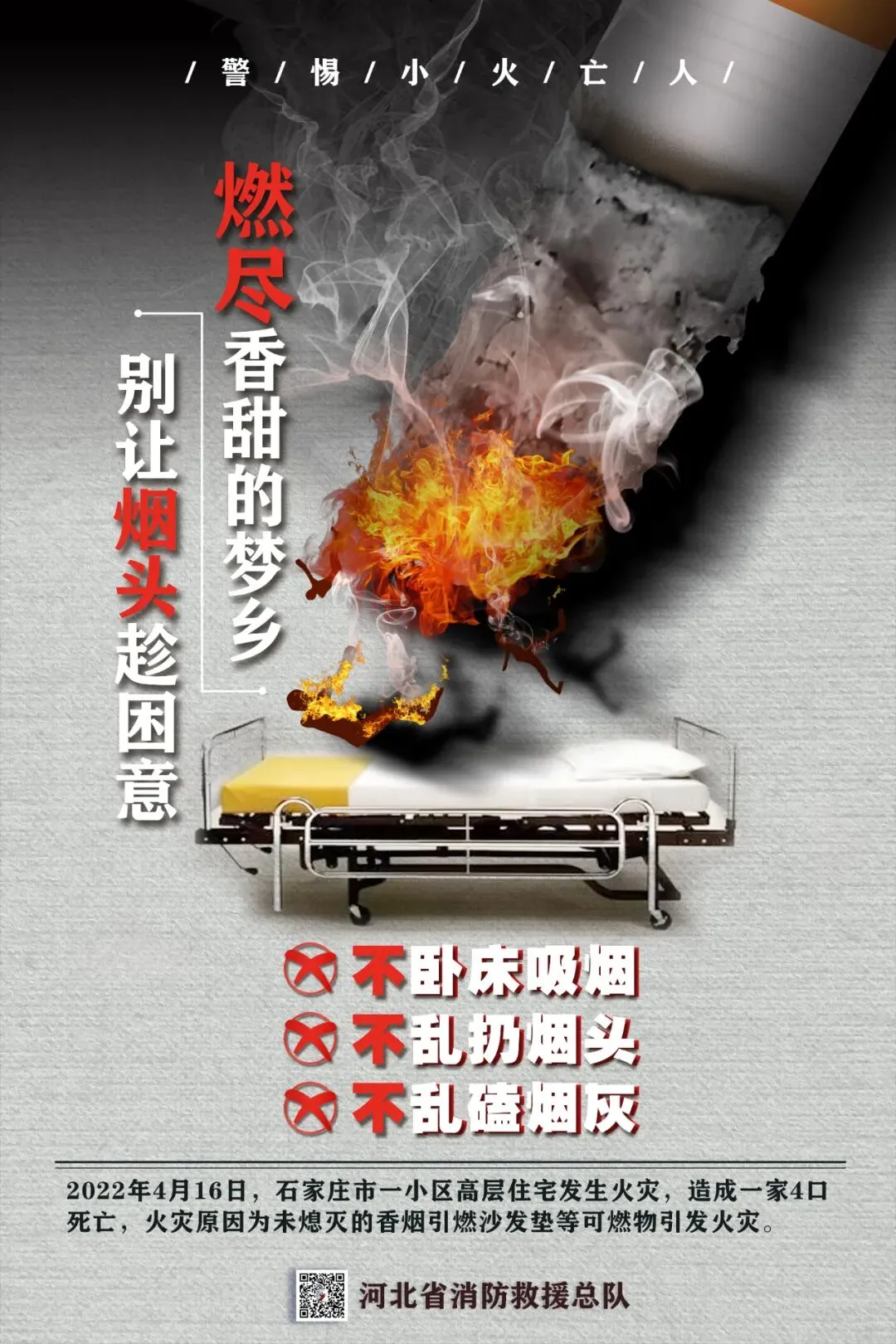 5.注意家庭用火用电用气安全,使用取暖器设备时远离易燃可燃物,不卧床吸烟,不乱扔烟头。