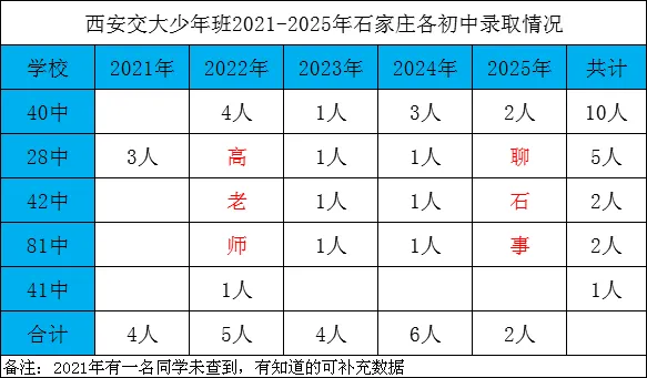 1、在录取人数方面,40中强势登顶第一,2021-2025年合计10人考进西交少年班,遥遥领先其他学校。且2022-2025年连续四年不断档,每年都有学生被录取,这反映出40中在多元育人方面表现出色,注重培养学生综合素质,不拘一格为学生提供多元升学路径。截至目前,40中已经有17名同学考进西安交大少年班,这一人数在石家庄所有初中里边也位于前三甲。