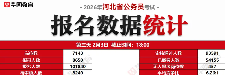 特别提醒:2026年公告中明确了报考人员的户籍以报名首日(2026 年 2 月 1 日)的户口所在地为准。截止至今天下午18点,河北报名人数已经达到101840人,目前457个岗位无人报考。最高竞争比76:1,热度还在持续上升中。→提醒大家,今年的报名时间为5天,报名期间要把握好节奏,不要太早,但也不要拖到最后,以防出现网址打不开等情况,错失报考机会。