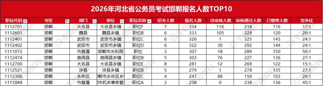 每年竞争前十岗位都是一大看点,截止至18点,竞争比最高的岗位是中共邯郸市委机构编制委员会办公室,职位代码是1111024。