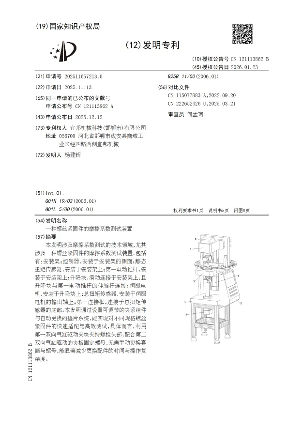 在机械制造、汽车工业及航空航天等领域,螺丝紧固件的连接可靠性直接关系到整体结构的安全性与稳定性,其中,摩擦系数作为影响预紧力控制的关键参数,其精确测量显得尤为重要。目前,行业内普遍采用专用的摩擦系数测试装置对螺栓、螺母组合的摩擦性能进行检测,以确保紧固件在实际装配过程中的扭矩‑张力关系符合设计要求。