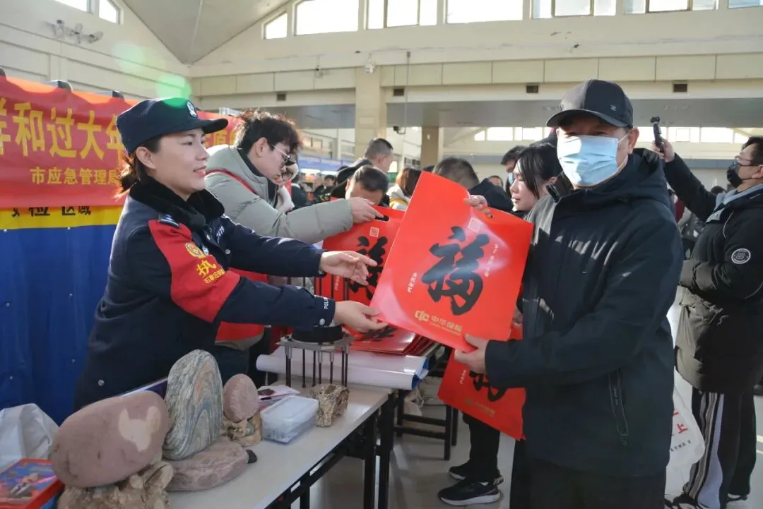 邢台站派出所联合多家单位在火车站候车室举办“安全带回家,祥和过大年”主题活动。现场设置安全知识福袋抽答环节,涵盖防盗防骗、违禁品识别等内容,旅客参与互动可获趣味盲盒。同时开设书法区赠送春联福字,将平安祝福融入佳节问候,提升旅客出行安全意识与体验。