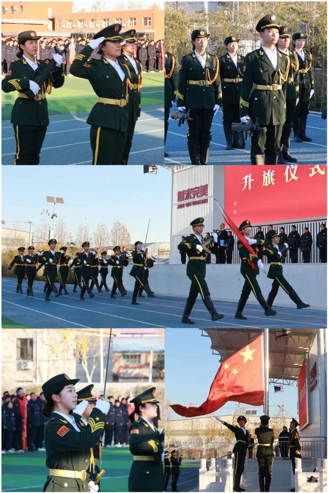 国旗护卫队迈着铿锵步伐,神情坚毅地护送五星红旗至升旗台。五星红旗冉冉升起,全体师生肃立注目,行礼齐唱国歌,嘹亮的歌声回荡校园,每一个动作都凝聚着庄严与力量,爱国情怀在心中激荡。