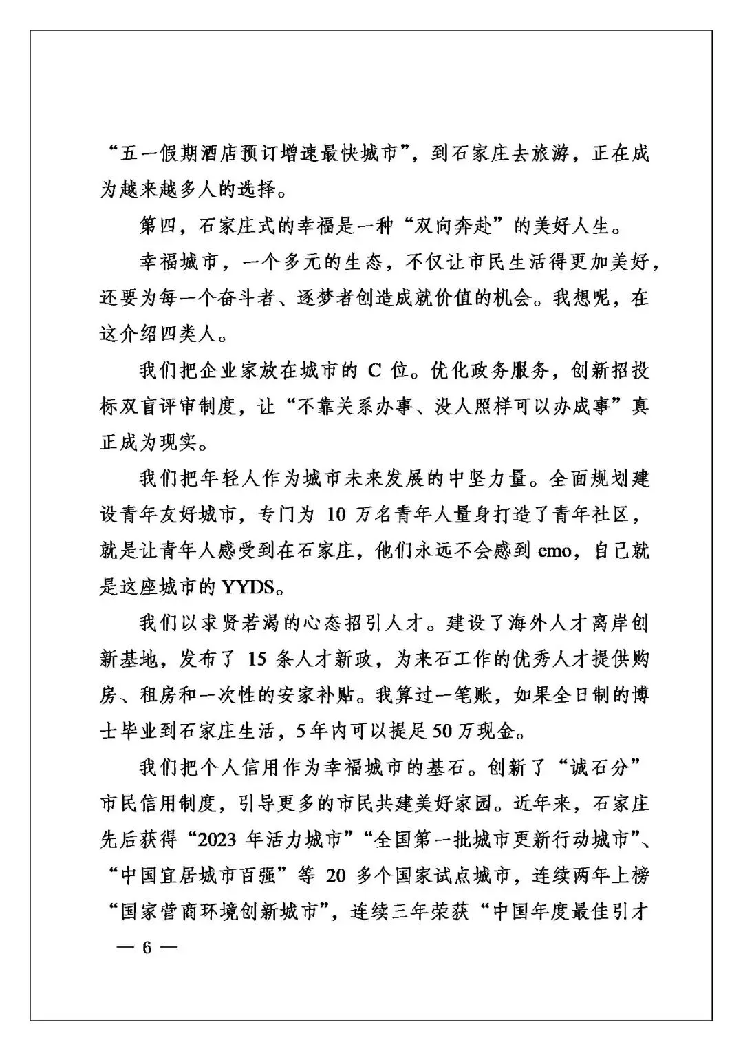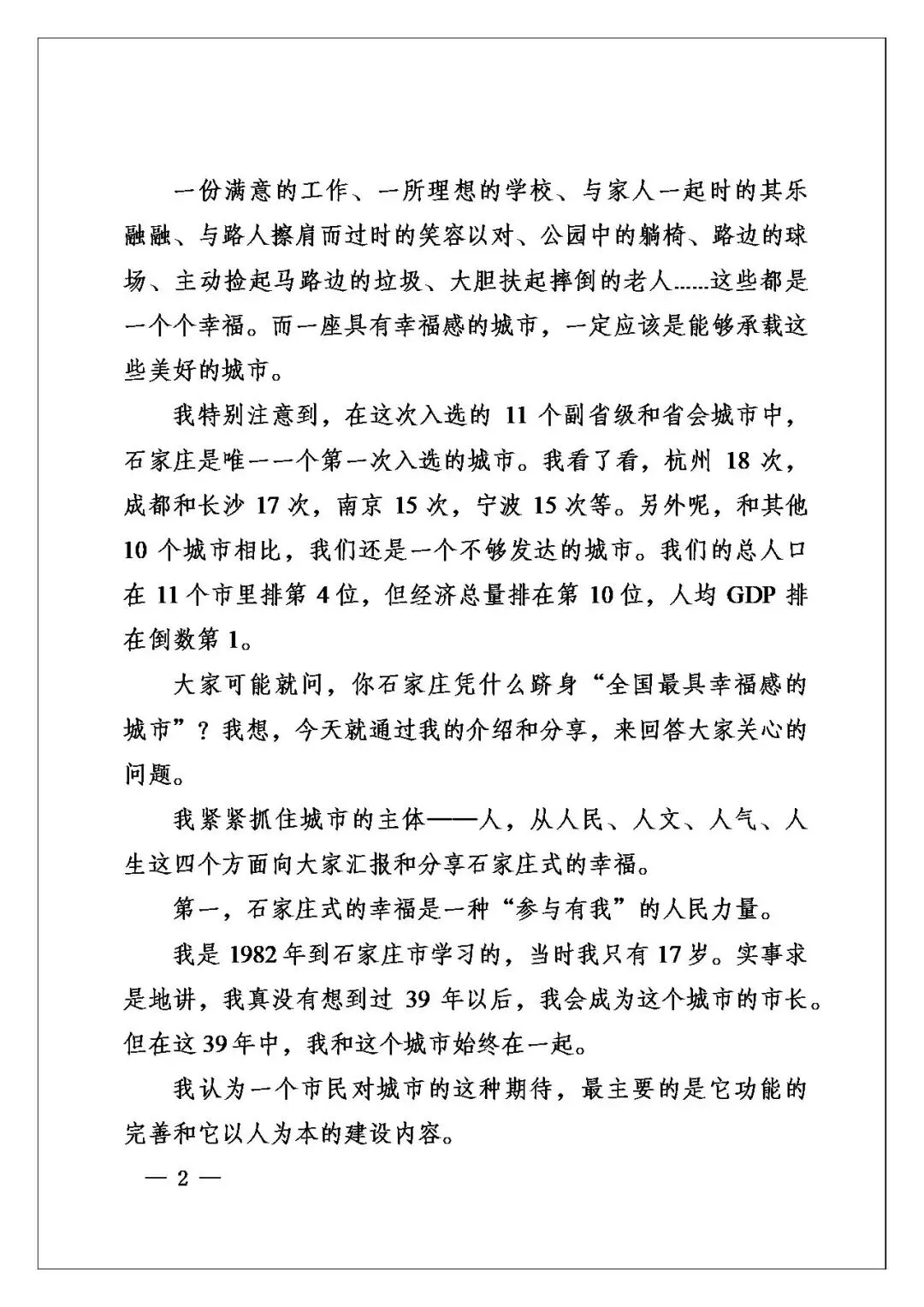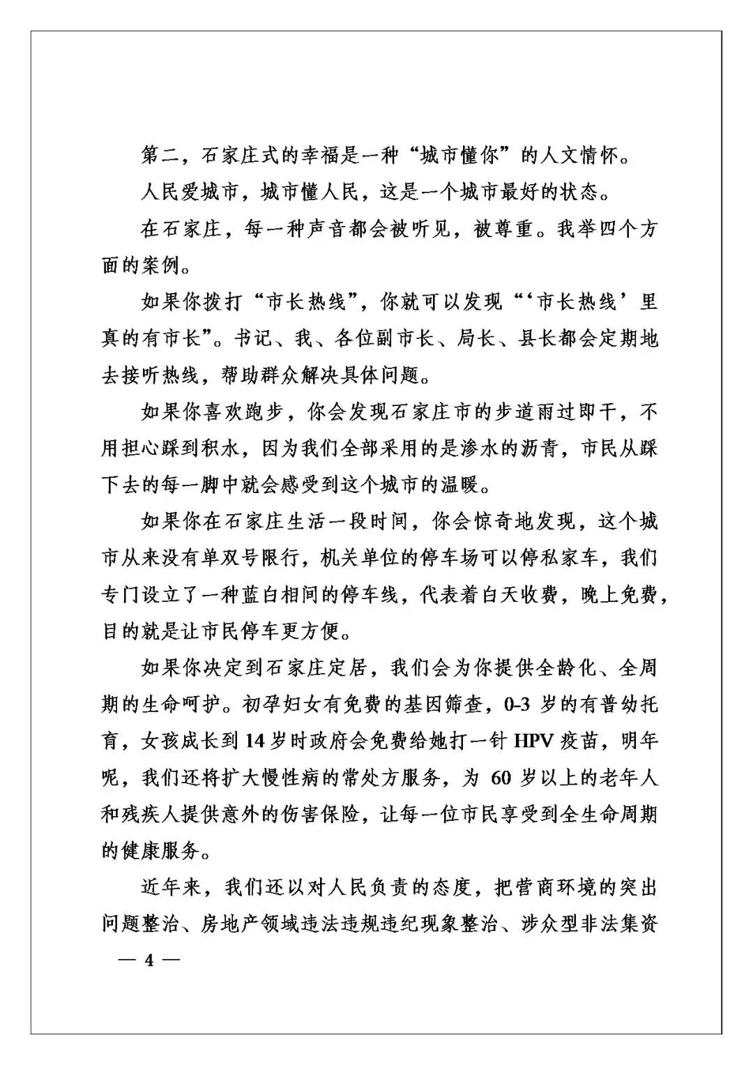 语言风格【划重点】特别自然,像坐在车上闲聊一样,有分量。用了不少生活化表达,我打个比方说“我们希望人文的阳光洒满城市每个角落”,有“让基本上每一个市民感受到温暖”,这种话不煽情却直击人心。是结尾那句“我在石家庄等着你来”,立马儿把城市变成了一个有温暖的“家”。
