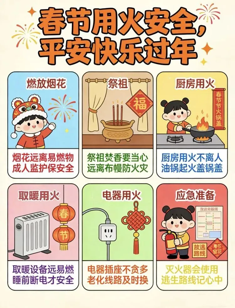 校园安全离不开家庭的密切配合。学校在此温馨提示全体师生及家长:春节期间请注意用火用电安全,不私拉乱接电线,规范使用取暖设备,防范火灾与一氧化碳中毒;严格遵守烟花爆竹燃放规定,远离易燃易爆物品;外出时牢记安全常识,遵守交通规则,确保人身安全。让我们家校携手,共同筑牢安全防线,让孩子们在平安呵护下欢度新春佳节。