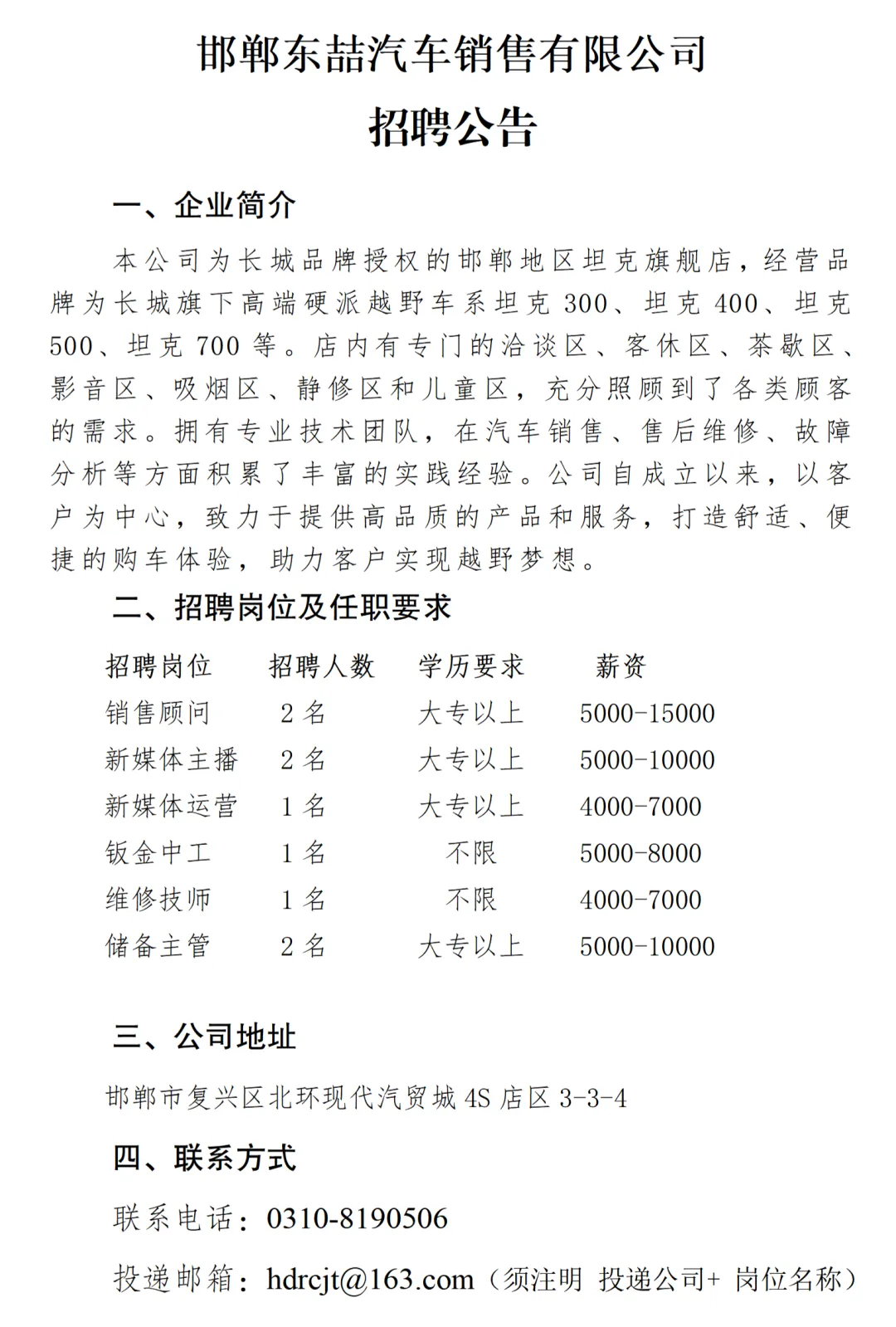 邯郸市人才发展集团 · 招聘快报 |邯郸东喆汽车销售有限公司招聘公告