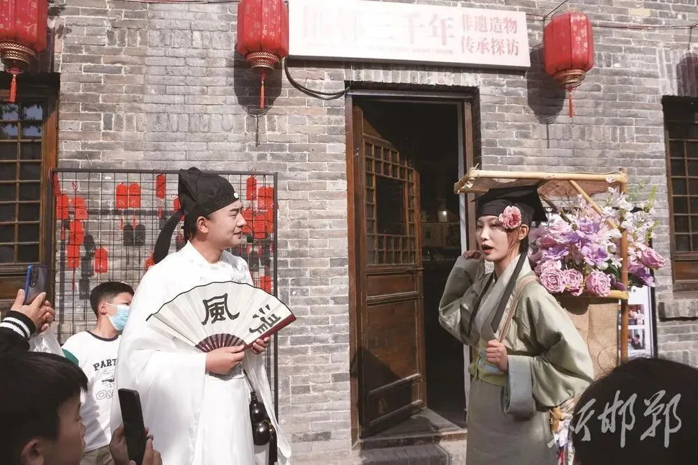 邯郸的“五一”,是一场跨越时空的文化对话。漫步邯郸道历史文化街区,战国袍的红色身影与古街的灰墙黛瓦相映成趣。身着华服的志愿者化身“赵国公主”,以沉浸式导览串联起成语典故、历史遗迹,让游客在移步换景中触摸邯郸的文脉。邯郸市美术馆广场的“来邯郸见一‘面’”市集,将武安拽面、永年驴肉卷饼等非遗美食与鲜花面食创意结合,舌尖上的“太行山珍宴”让游客大快朵颐。而在广府古城、娲皇宫等景区,非遗傩戏、太极拳表演与AR技术交融,千年技艺在光影中焕发新生。