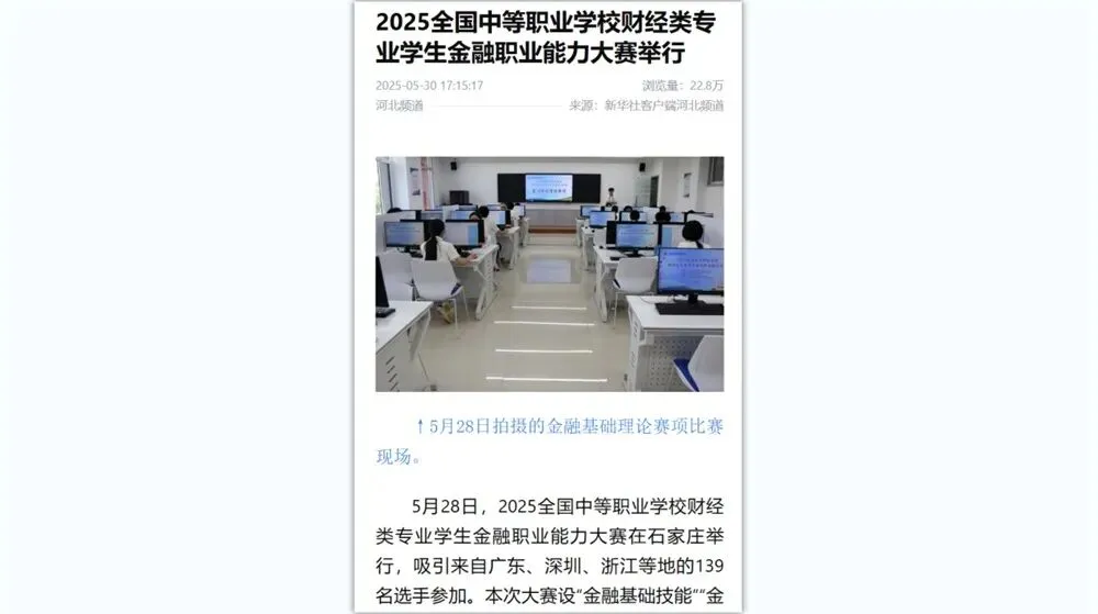 学校凭借专业组织能力,圆满承办多项职业技能赛事,综合办赛水平获广泛赞誉。成功承办了2025年全国中职财经类专业学生金融职业能力大赛、2025一带一路暨金砖国家技能发展与技术创新大赛之第三届实验室安全技术赛项(中职组)全国总决赛、河北省职业院校技能大赛食品药品检验赛项、企业财务数智化应用技能赛项等各级各类比赛共15项。持续发挥区域职业技能赛事承办核心支撑作用,赛事组织工作获新华社客户端、河北省电视台等主流媒体报道,彰显较强的综合保障与组织协调能力。
