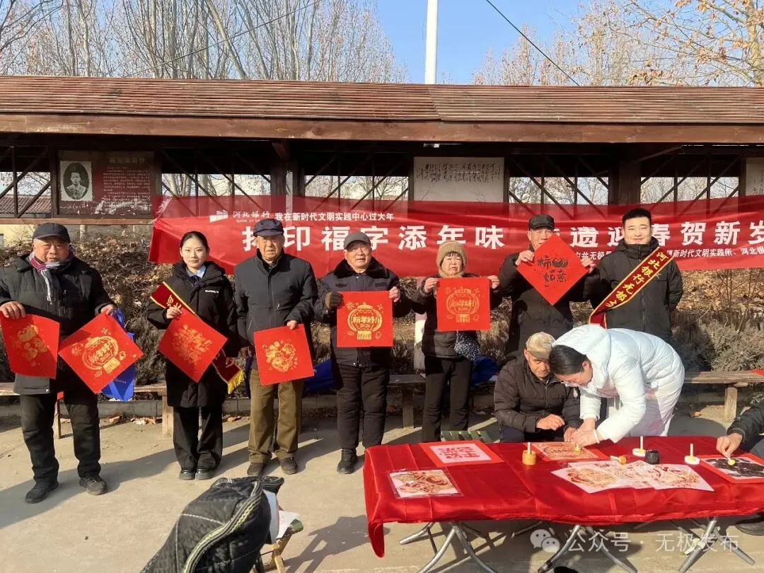 腊月集市烟火旺,非遗拓印送福来。2月3日,由中共无极县委宣传部、无极县新时代文明实践中心、河北银行无极支行联合主办的“拓印福字添年味 非遗迎春贺新岁”活动走进东关大集,将春节习俗与传统文化、金融惠民服务相融合,让群众在指尖互动中感受中华优秀传统文化魅力,在热闹市集里体悟文明实践温度,为马年新春增添了浓厚的喜庆氛围。