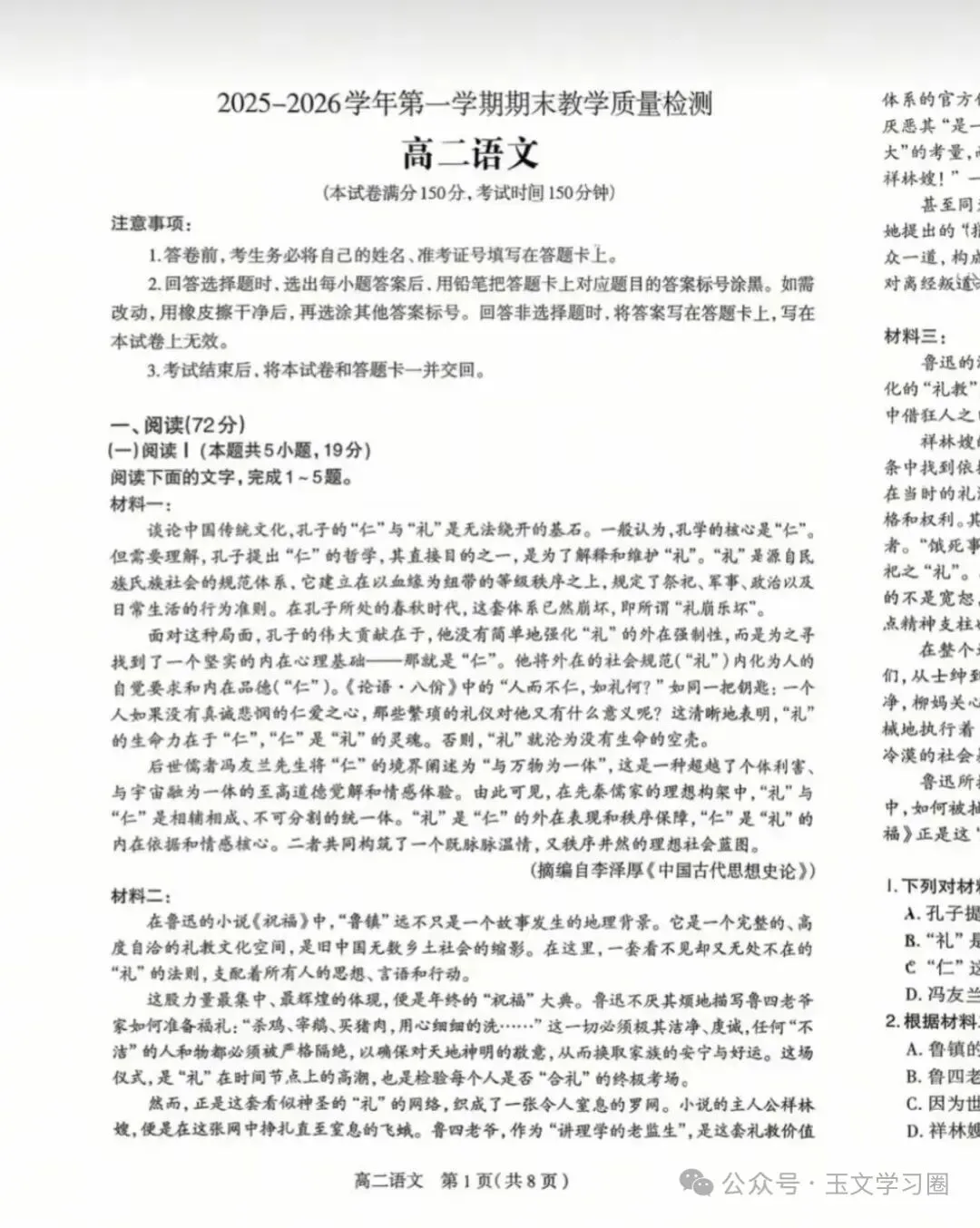 全科发送!石家庄市高二期末考试2025-2026学年第一学期期末教学质量检测全科答案及试题