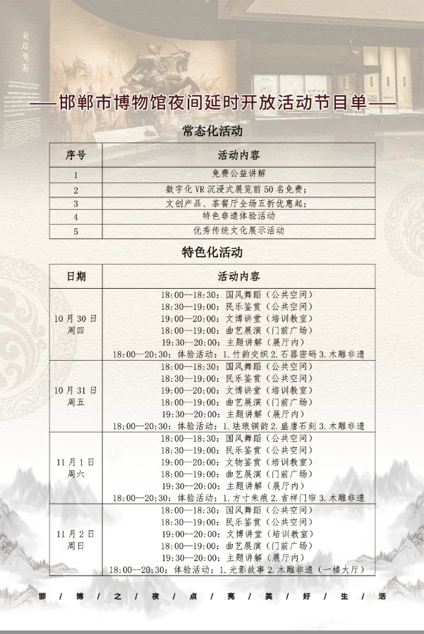 10月28日起,邯郸市博物馆夜场开放啦,不用早起也不用挤周末,下班顺路就能打卡~