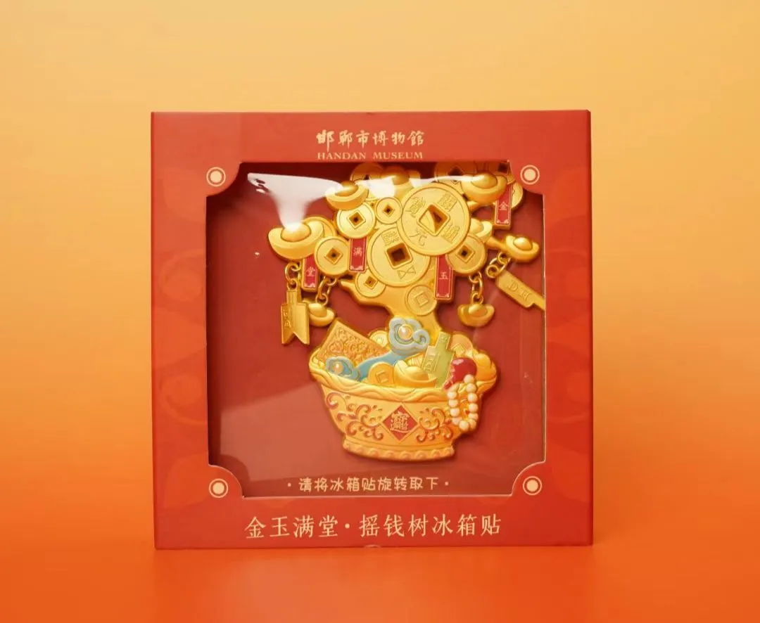 临近国庆,馆内又悄然酝酿着新一轮的文创上新。在文创展示区,邯郸市博物馆文创部主任徐国栋手持一枚“金玉满堂·摇钱树冰箱贴” 细细讲解:“看这聚宝盆上的纹饰,完全复刻自赵王陵出土的透雕螭龙纹金牌饰!”方寸之间,迷你甘丹刀币、布币错落点缀,五铢钱的纹路清晰;最妙的是树下的聚宝盆,凑近细看,赵文化透雕螭龙纹金牌饰、红玛瑙带钩等文物的微缩造型暗藏其中,每一处都是从博物馆展厅里“搬”来的珍贵印记。