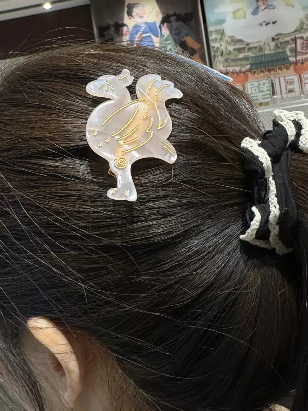 其中,“朱雀冠羽”发夹灵感来自金银涂乘舆大爵酒樽的樽盖,朱雀冠羽如火焰升腾,象征南方与重生;“瑞兽佑安”发夹则取材隋代彩绘镇墓兽,寓意守护平安、辟邪纳福。