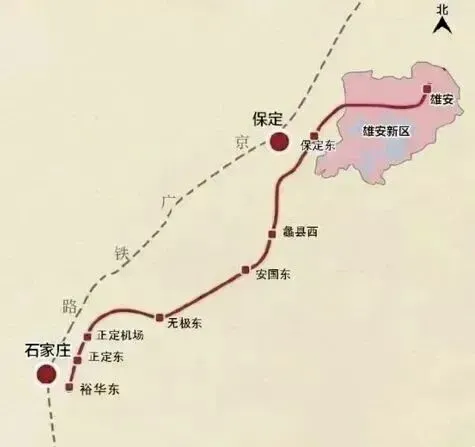 新建线路长约156公里,利用雄忻高铁引入雄安站,预留蠡县经任丘至雄安段线路接入条件。