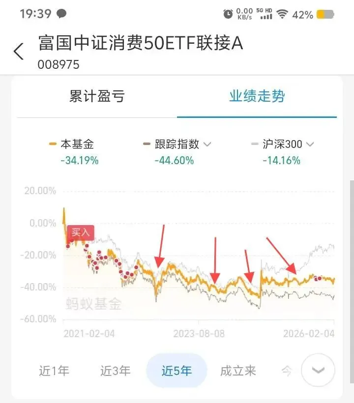 本周发了工资,取20%定投,即1400元。前段时间,消费“老登”也涨了一下子,给人感觉可能板块轮动要转到这了。再有,根据过去的经验,持仓的基金在低谷的时候一定要趁机加仓,越不加仓越解不了套,更赚不到钱。所以,我决定:接下来的一段时间的定投,把场外基金加加仓,暂时不往股票账户里转了。以下图的消费50为例,箭头所指的这些大深坑,正是加仓的好时机: