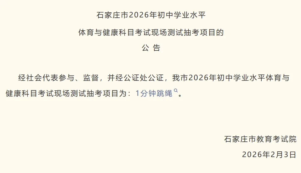>【权威发布】石家庄市2026年初中学业水平体育与健康科目考试现场测试抽考项目为1分钟跳绳