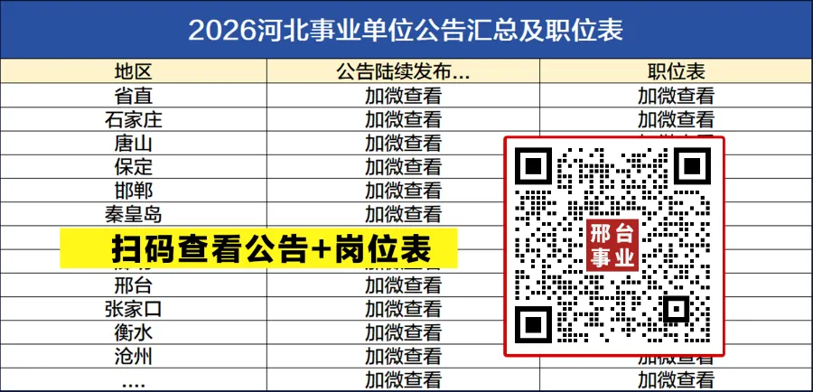 2026年邢台市事业单位统一招聘工作人员835名,各招聘单位招聘人数、具体岗位、考试类别、资格条件、咨询电话详见《邢台市2026年事业单位公开招聘(统一招聘)岗位信息表》(附件1,以下简称《岗位信息表》)。《岗位信息表》通过邢台市人力资源和社会保障局官网(https://rsj.xingtai.gov.cn/)查询。