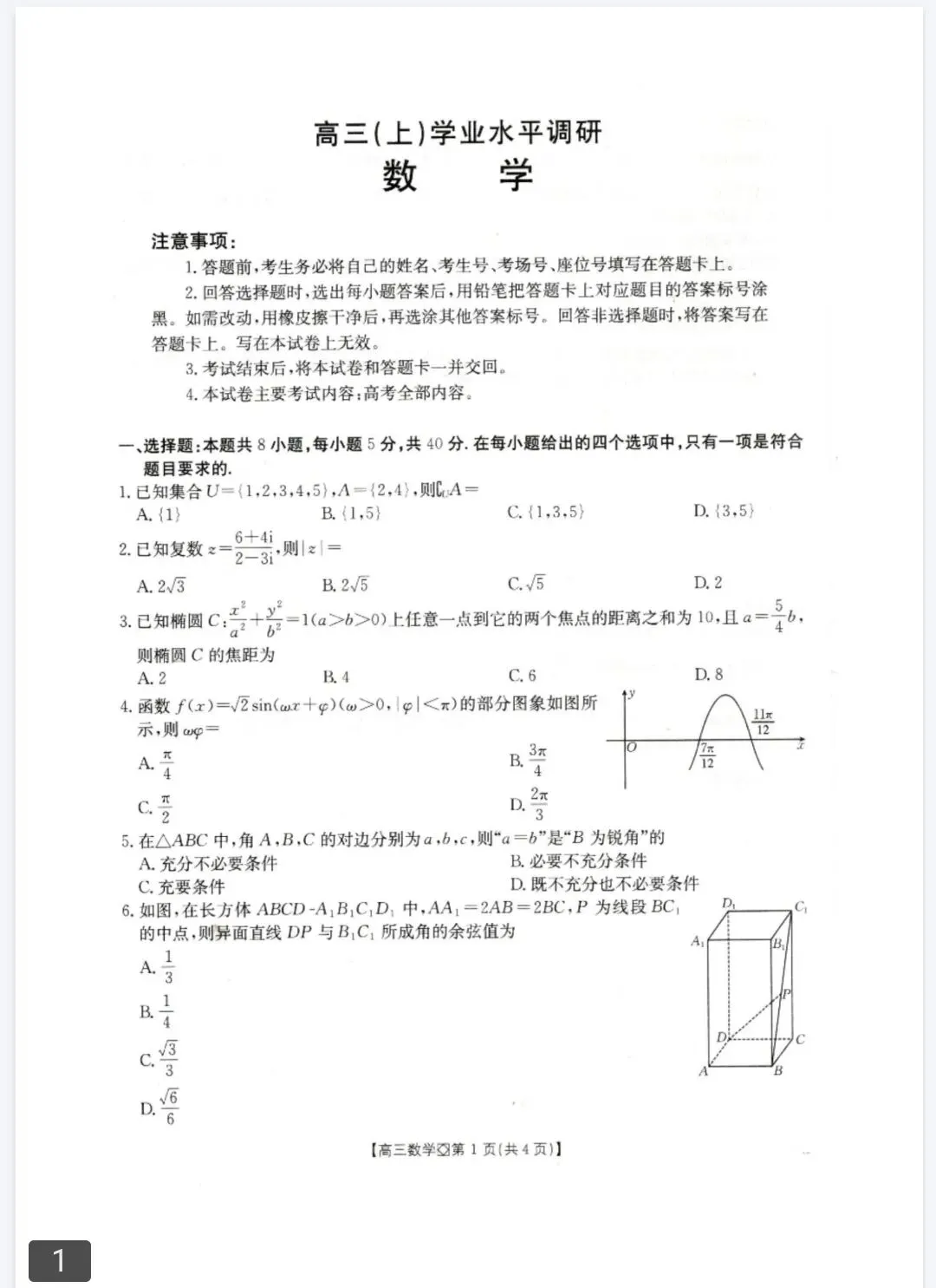 【高三数学】2026届河北省石家庄市第一中学高三年级统一摸底考试全科试卷+答案