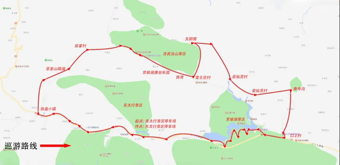 起点:东太行景区停车场——晨曦酒店——马店头村(南路口)——马店头村(北路口)——大会庄——门王庄(路口)——前渠村(北路后)——后渠村——田鑫小镇——茶壶山隧道——后掌村——大屯村——常杨庄——古武当山景区——庙上村——康谷乐园景区——西湾——天阳鄄——武当大道——口上村——达衣岩村——李家庄村——楼上村——终点:东太行景区停车场