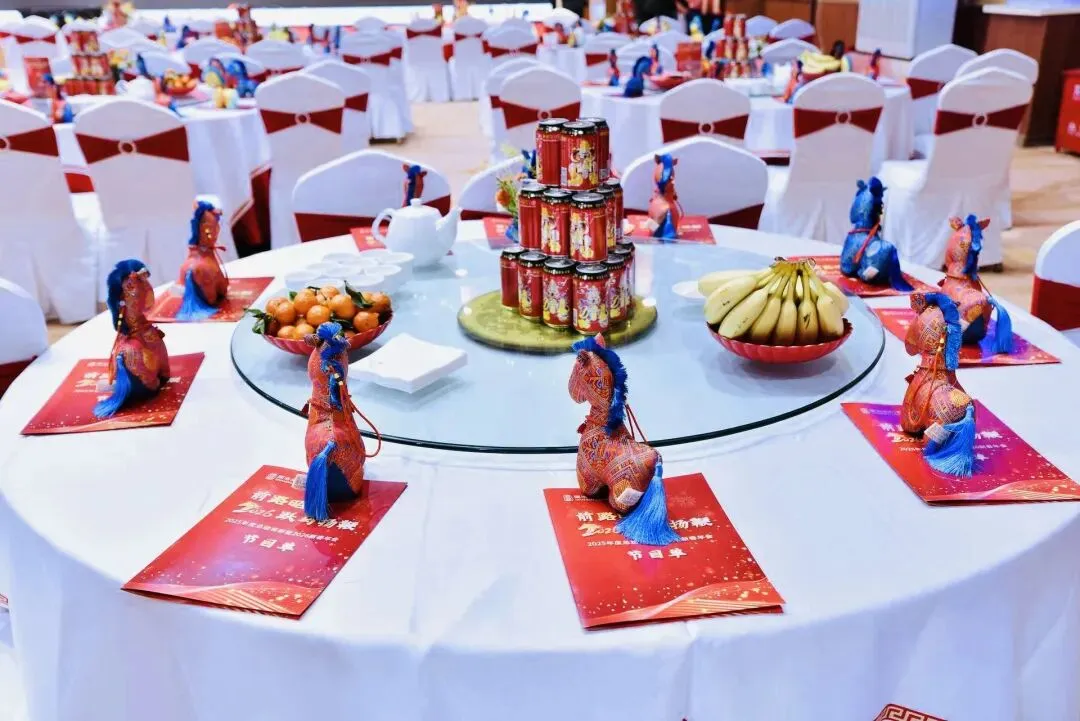红金交织的主舞台恢弘大气,主题大屏与会场光影相映,勾勒出兼具仪式感与沉浸感的空间氛围;精心设计的签到打卡区,让每位入场嘉宾都能收获专属的新年仪式感,成为年会伊始的美好记忆点。