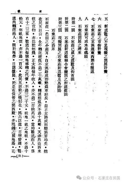 一、石家庄之沿革二、石家庄之重要三、石家庄之现状与前途之障碍四、石家庄之新道岔联合会五、新道岔之不足与拟制开展的计划六、石家庄的街市规划七、石家庄京汉铁道东西两侧应有隧道八、石家庄可建成水旱码头九、石家庄开展后的未来附录一图 石家庄已建成的道岔及街市图附录一图 石家庄新道岔联合会开辟的新道岔图
