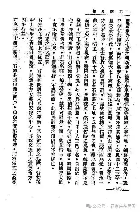 二、石家庄之重要 石家庄在交通上的地位,石家庄既是正太、京汉铁路的要冲,又是沧石铁路的起点。按照孙中山先生的实业计划,这里还是北方大港到西安线路的中心,其在交通上的重要性,自然不必多说。石家庄与山西的关系,石家庄是山西的门户,山西的实业越发达,石家庄的商业也必然随之兴旺。因为铁路的进口货物从这里进入,出口货物也从这里运出。所以石家庄的转运是否便利,关系到山西的进出口货物是否不受影响;石家庄的金融是否活跃,关系到山西的各类贸易是否不受阻碍。