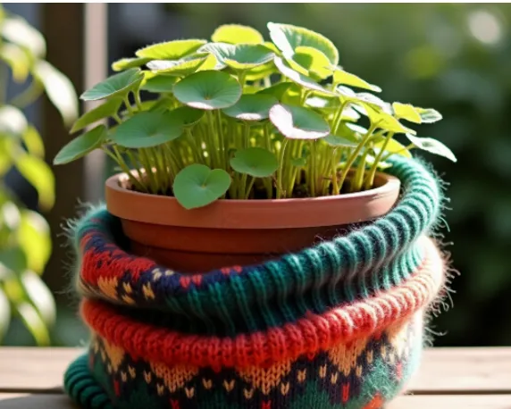 羊毛纤维有天然的温度调节功能 ,既能保温,又透气不闷根。关键是毛衣的编织结构形成了很多小气室,就像给花盆建了个“保温层”。