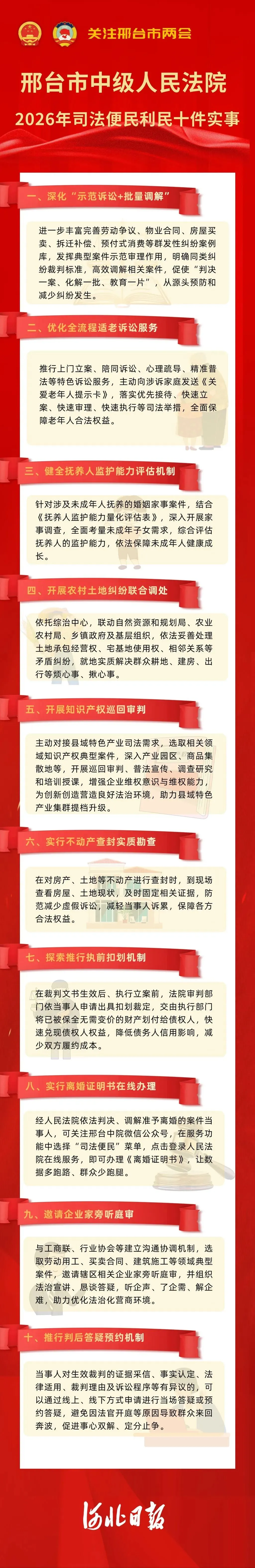 2026年邢台法院司法便民利民十件实事包括深化“示范诉讼+批量调解”、优化全流程适老诉讼服务、健全抚养人监护能力评估机制、开展农村土地纠纷联合调处、开展知识产权巡回审判、实行不动产查封实质勘查、探索推行执前扣划机制、实行离婚证明书在线办理、邀请企业家旁听庭审、推行判后答疑预约机制等人民群众普遍关切的司法实事。