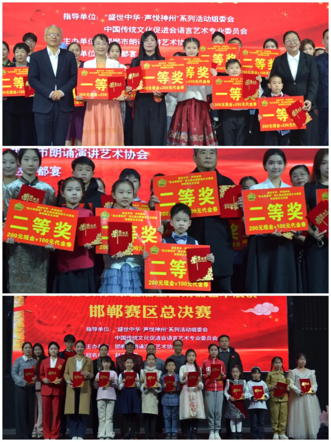 (二)赛事展演硕果累累。积极搭建展示平台,参与协办“盛世中华 声悦神州”第四届全国朗诵大赛,荣获“最佳组织奖”,主席任紫霞担任大赛评委,副主席裴宗伟、理事宋爱华担任主持人,17名参赛选手斩获少儿组、成人组特金奖、金奖等荣誉,刘娟、温佳烁分获“盛世之星”“希望之星”特别奖。成功主办“盛世中华 声悦神州”赵古都宴杯第五届全国朗诵艺术展演,选拔多名优秀选手晋级国家级展示舞台。在河北省第三届“燕赵杯”朗诵艺术年展中,魏莹、董新红等5名会员斩获多项省级荣誉;第八届“演说中国”青少年展示活动中,少儿会员李青岩、刘沛摘得全国总决赛桂冠;“古韵新声 诗意中国”全国诗诵大赛上,副秘书长魏莹、李琨朗诵的原创作品《成语之都的礼赞》荣获金奖。此外,协会还获评“艺起成长”公益大师课表彰会“杰出贡献奖”,联合出品的广播剧《锦上添花》荣获第十四届河北省文艺奖。