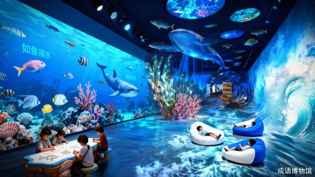 以日月星辰与海洋成语为线索,打造沉浸式科技艺术场域。置身体感交互与数字投影共塑的“成语气象”,亦可漫游于动态海洋画卷间,感受成语意境的光影流转。