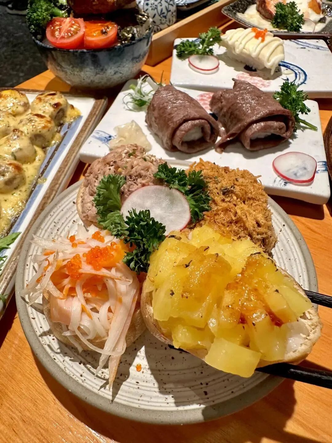 店里菜品种类特别多,盲点不踩雷:澳洲顶级铺天盖地火牛寿司、非遗糯叽叽手工年糕、冰激凌椰片烤红薯、芝士口蘑配鱼籽,每一样都很绝。