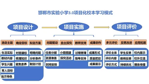 (二)形成优质项目集群,凸显校本特色。截至目前,学校累计形成20余个成熟实践案例,优选13个作为重点展示成果。所有项目紧扣教材,挖掘本土文化、贴合生活实际,涵盖语文《邯郸道路图鉴》《邯郸成语推荐官》、数学《让年月日“活”在钟表与日历里》《知行乐购》《舌尖上的实验室》、艺体学科《剪纸传承小匠人》《励志钢铁意志》等多个学科、多个主题,实现学科知识与实践能力、文化传承的有机统一,让学生在项目化学习中感受知识温度、汲取成长的力量。(三)迭代实践模式,形成校本范式。历经三年探索,项目化学习完成模式升级,凝练成兼具校本特色与推广价值的实践范式。以三级组织架构为支撑,既保留学科特色、又实现深度融合,既贴合课堂实际、又兼顾师生成长,实现学生核心素养、教师专业能力与学校课程体系的提升,形成可研究、可复制、可推广的实践样本。三年实践,是项目化学习的探索之路,更是跨学科深度融合之路,但是,在实践探索中仍有一些短板待补:一是视野格局待拓宽。教师对项目化学习的认知多囿于校内理论分享与案例研讨,缺乏向先进地市、标杆学校实地观摩的契机,因此对创新模式的感知不深,限制了实践探索的思路。二是转化创新待发力。因未与先进学校建立直接对标交流机制,借鉴先进经验时,难以精准把握落地细节,部分先进理念向校本实践转化时适配度不足,成效与预期仍有差距。