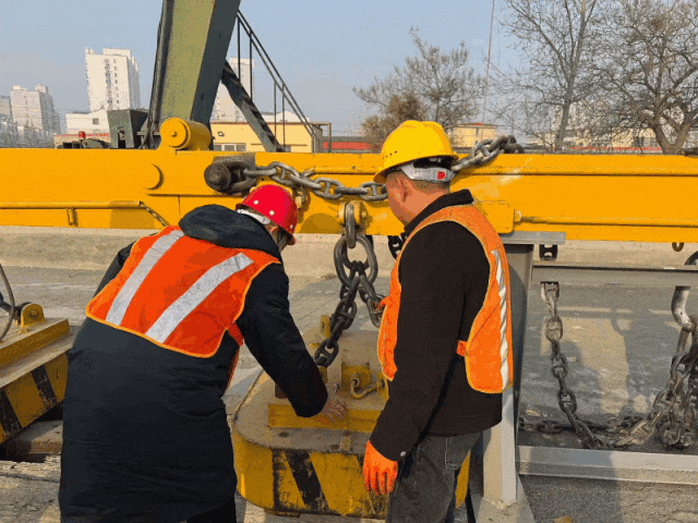 任丘、辛集营业部对门吊索具、吊钩等重点部位进行隐患排查整治,从源头上消除装卸安全隐患,确保起重设备处于安全可靠状态。(任丘、辛集营业部供稿)