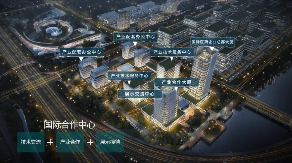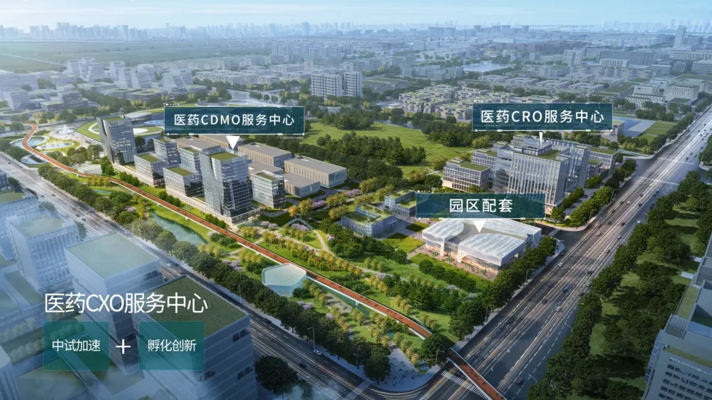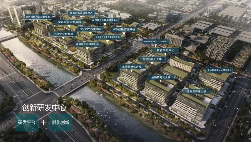 园区北部是研发创新孵化区,占地307.2公顷, 承担园区内生物医药产业创新孵化、技术研发、国际交流合作功能,形成园区北部对外开放窗口;中部是创新生物药及CXO产业区,占地443.7公顷,重点打造重组蛋白药物、抗体药物、生物疫苗与佐剂、CMO等生物药产业化基地;南部是医药制剂产业区,占地469公顷,聚焦化药制剂、现代中成药生产,打造医药制剂产业化基地;东部是高端医疗器械及医药装备产业区,占地293.3公顷,构建体外检测试剂、可植入医疗器械、医疗康复器械等医疗器械产业区;西部是生活配套区,占地321.6公顷, 围绕TOD站点,建设园区配套住宅,打造舒适宜居的生活服务区。