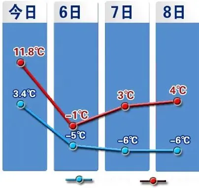 周末两天降雪结束,天空放晴。而降温才是重点,明天气温直线下降,最高温度降至-1℃左右,最低温度跌至-6℃上下,山区和地势低洼地带更是低至-12℃,大家在外出时一定要穿的厚一些,注意做好防寒保暖措施。到了周末,气温稍有回升,最高温度将升至3~4℃附近,最低温度在-6~-5℃之间,请及时留意天气变化。