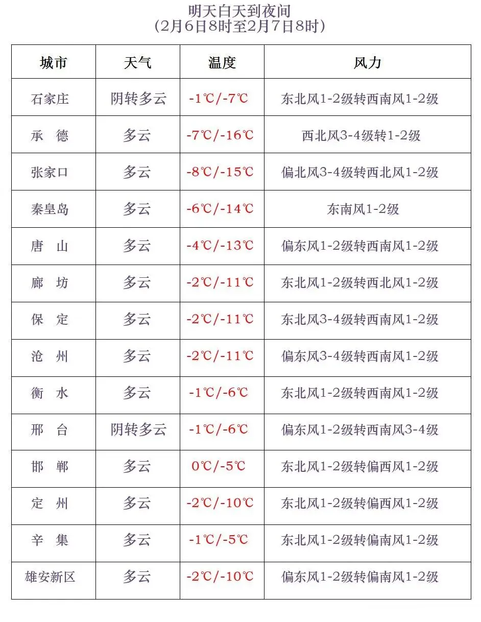 后天夜间:晴间多云 风向风速:偏北风1—2级 最低气温:-6℃