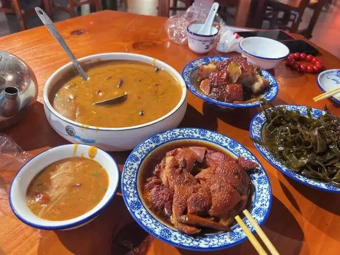 中午南城门附近吃一顿,八大碗里挑仨,扒肘子、红烧丸子、烩菜,白饭两碗不夸张。